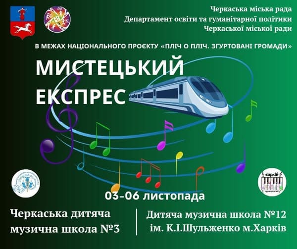 03–06 листопада у Черкасах відбудеться яскравий культурно-освітній проєкт «Мистецький експрес», що об’єднає юних музикантів Черкаська дитяча музична школа 3 та Дитячої музичної школи №12 ім. К. І. Шульженко м. Харкова.