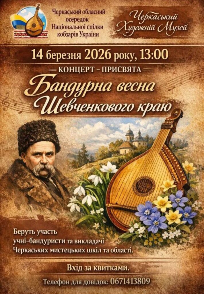 У стінах Черкаського художнього музею відбулася знакова мистецька подія – концерт-присвята «Бандурна весна Шевченкового краю», який об’єднав кращих бандуристів Черкаської області. Організатор – народна артистка України Лідія Зайнчківська , завдяки ініціативі, наполегливості та творчому баченню якої ця подія стала можливою та набула такого високого художнього рівня.